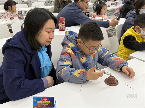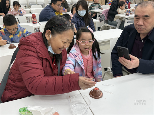 為讓抽象原理更直觀,活動(dòng)設(shè)置模擬火山噴發(fā)實(shí)驗(yàn)環(huán)節(jié)?,F(xiàn)場(chǎng)備好黏土火山模型、小蘇打、白醋等物料,容東林一邊操作一邊講解:向“巖漿腔”倒入小蘇打并加紅色素,再注入白醋,紅色“巖漿”瞬間噴涌而出,引得居民驚嘆、孩子們目不轉(zhuǎn)睛。他引導(dǎo)大家觀察全過(guò)程,深入淺出解釋酸堿反應(yīng)原理及火山灰對(duì)生態(tài)環(huán)境的影響,還邀請(qǐng)孩子們近距離體驗(yàn),激發(fā)科學(xué)探索興趣。