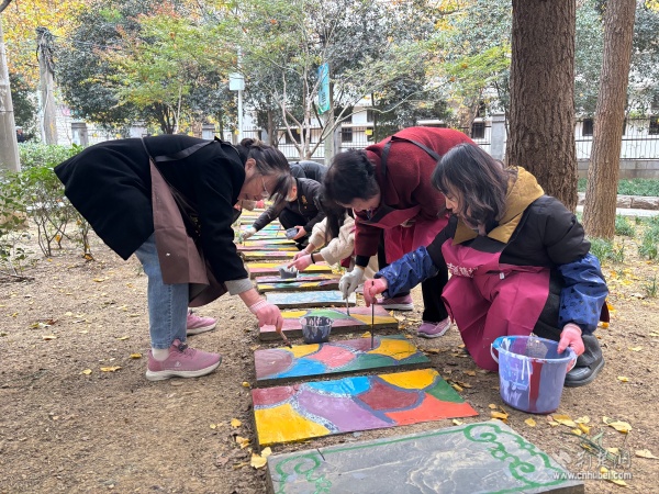30余名黨員與社區(qū)居民攜手執(zhí)筆,在社區(qū)能人的指導(dǎo)下,依據(jù)設(shè)計圖稿細心勾勒線條,精心調(diào)配赭石、石青、石綠等傳統(tǒng)礦物色彩,悉心填充花瓣、枝葉。草坪里原本素樸的地磚漸漸綻放出繽紛圖景:象征革命精神的紅色印記、勾勒武昌古城風(fēng)貌的文化符號,以及依循“十二花令”鋪陳的水仙、桃花、菊花等時令花卉與梅蘭竹菊的清雅風(fēng)骨藝術(shù)化呈現(xiàn)。