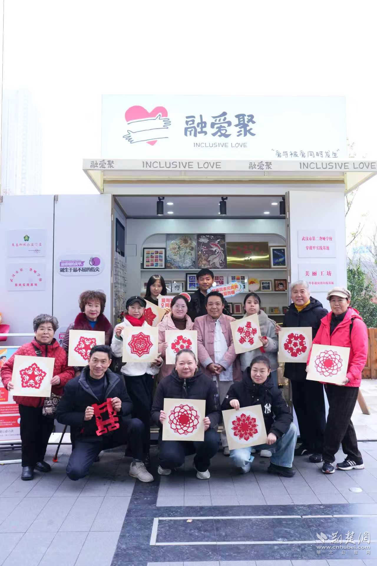 活動當天,武漢剪紙非遺傳承人、湖北省工藝美術大師葛?,F(xiàn)場展示并手把手教授以“融愛萬家”為主題的剪紙作品。來自黃陂“美麗工坊”的朱熙老師也帶來了編繩技藝,與居民面對面交流。
