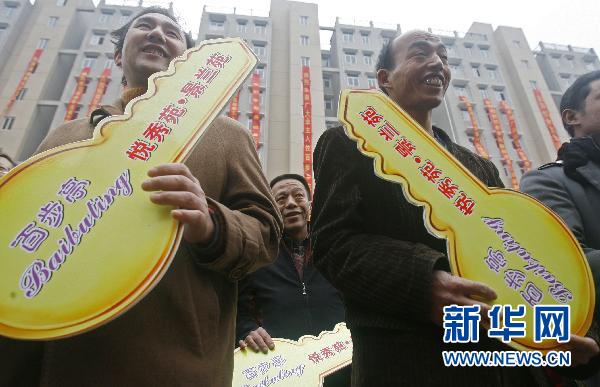 這是首批住戶(hù)代表在武漢市最大的保障性住房項(xiàng)目——百步亭社區(qū)悅秀苑、景蘭苑交房?jī)x式上領(lǐng)到鑰匙(2009年12月8日攝)。 新華社發(fā)