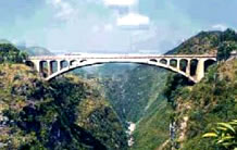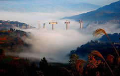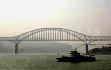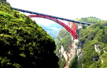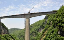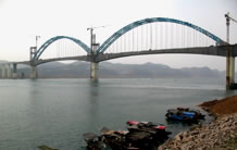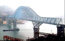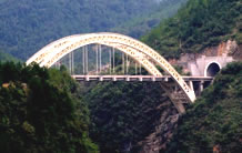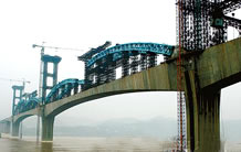 湖北宜萬(wàn)鐵路野三河大橋位于湖北省恩施州建始縣與巴東縣交界處,它是一座主跨為124米不對(duì)稱(chēng)雙線平行雙肋中式復(fù)合鋼管混凝土桁架坡拱橋,由中承式拱橋和下承式拱橋兩部分組成,這種不對(duì)稱(chēng)坡拱橋在國(guó)內(nèi)尚屬首例。該橋由湖北省交通規(guī)劃設(shè)計(jì)院設(shè)計(jì),于2006年3月份開(kāi)工,2007年1月成功合龍。