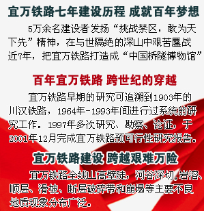 宜萬(wàn)鐵路開(kāi)建可以追溯到1909年12月10日,其前身是川漢鐵路,最早由詹天佑主持修建,從宜昌往秭歸修了20多公里就被迫停工。直到2003年,鐵路才重新開(kāi)工。從2003年12月開(kāi)工至2010年8月18日宜萬(wàn)鐵路全線鋪軌貫通,耗時(shí)七年,377公里的宜萬(wàn)鐵路平均每年建成里程僅50多公里,成了國(guó)內(nèi)修建時(shí)間最長(zhǎng)鐵路。