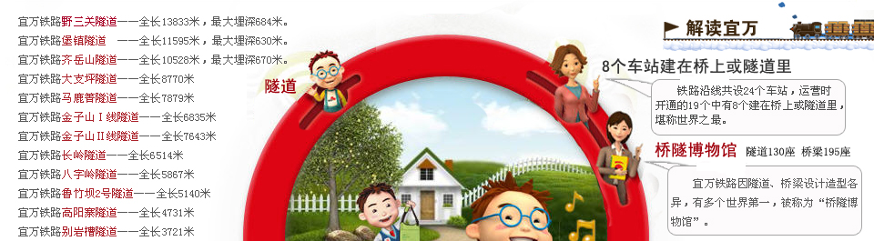 宜萬(wàn)鐵路被稱(chēng)為“橋隧博物館”。全線共有隧道159座(其中一級(jí)風(fēng)險(xiǎn)隧道8座,二級(jí)風(fēng)險(xiǎn)隧道26座),其中10公里以上隧道5座,總長(zhǎng)338.7公里;全線有橋梁253座,總長(zhǎng)69.64公里,其中特殊結(jié)構(gòu)橋梁29座,涵洞600多座;正線橋隧占線路總長(zhǎng)的74%。據(jù)中鐵四局宜萬(wàn)指揮部人士稱(chēng),宜萬(wàn)鐵路的橋隧占比為世界之最。