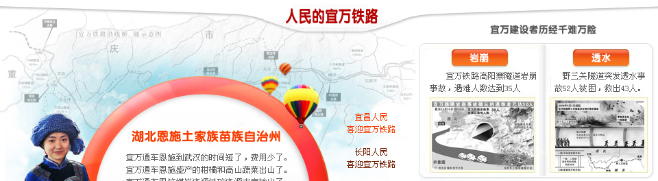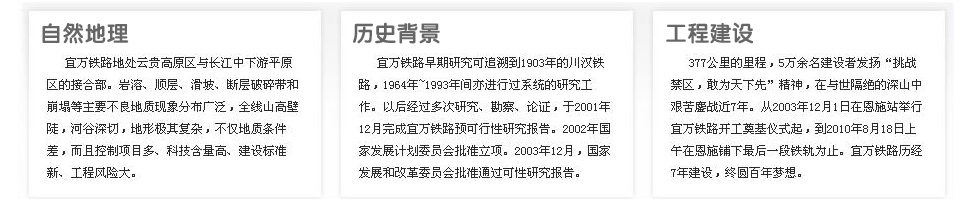 宜萬(wàn)鐵路因穿越喀斯特地貌地區(qū),被譽(yù)為我國(guó)鐵路史上施工難度最大的山區(qū)鐵路工程。它集“西南山區(qū)鐵路艱險(xiǎn)之大成”,專(zhuān)家們稱(chēng)之為“筑路禁區(qū)”。修建難,最難在隧道。宜萬(wàn)鐵路的159座隧道中有70%位于石灰?guī)r地區(qū)。在中國(guó)鐵路建設(shè)史上,因?yàn)橐巳f(wàn)鐵路,第一次為鐵路隧道按風(fēng)險(xiǎn)分為輕、中、高3個(gè)等級(jí)。