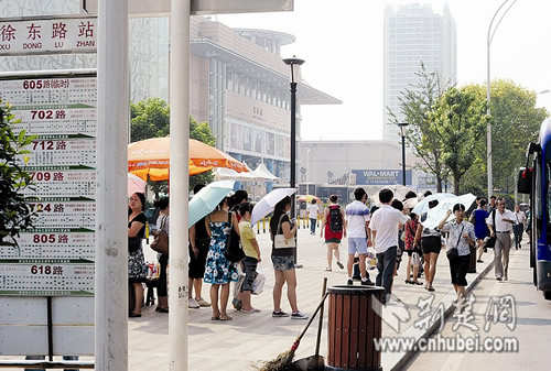 烈日當(dāng)空 武漢候車市民苦盼一片“屋檐”